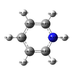 Below: The charge distribution diagram of Pyridinium. Red is negative and green is positive and the charge range is from +0.483 to -0.483. Note that in all diagrams Nitrogen is on the right of the ring. The left diagram shows the charges as a coloured heat map. The middle diagram shows the charges numerically and the diagram on the right is the numbering system of the molecule to aid reading of the analysis below the diagram.