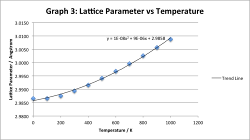 We observe that the higher temperature data points deviate slightly from the trend at the lower temperature data points (the lattice parameter rises at a slightly smaller rate at higher temperatures). The resultant new trend line (now trying to represent the correlation between the variables over the entire range) has a slightly different quadratic equation and we see that now all the data points do not perfectly fit with the new trend line.