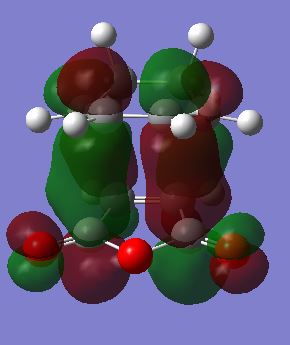 The secondary orbital interaction that stabilises the endo- transition state is predicted to be between the carbonyl groups and the double bond on the cyclohexa-1,3-diene. It is expected to be present in the HOMO of the transition state. However, this was not observed as above in the HOMO of the endo- transition state. There is no in-phase overlap between the orbitals on the carbonyl groups and those on the double bond on cyclohexa-1,3-diene. The search for the secondary orbital interaction was carried out by visualising the molecular orbitals from HOMO-3 to LUMO+3. Out of these, only LUMO+1 and LUMO+2 showed the secondary orbital interactions, and they are also shown in Table 20. The p orbitals of the carbonyl carbon in the maleic anhydride overlap in phase with the p orbitals of the double bond in cyclohexa-1,3-diene. However, the LUMO+1 and LUMO+2 do not contribute to bonding, hence the secondary orbital interactions in these MOs would not contribute to lowering the energy of the transition state as expected. It should also be noted that no secondary orbital interactions are observed in any of the MOs from HOMO-3 to LUMO+3 for the exo- transition state. A possible explanation for the LUMO+1 and LUMO+2 of the endo- transition state showing the secondary orbital interactions instead of the HOMO is that the energy levels of the MOs may be quite close (Is that the case in your calculation? João (talk) 17:14, 23 March 2015 (UTC)), and the order of the MOs may change slightly if mixing of the orbitals occurred upon combining the reactants. The low level of theory used here for the calculations could also be a possible reason for deviation from what is reported in the literature.