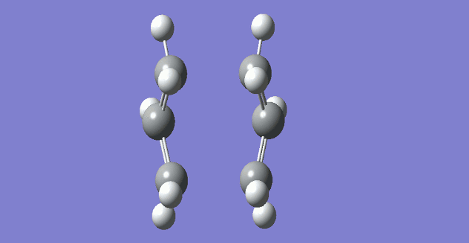 For a successful QST2 calculation to be carried out, the reactants and products need to bear sufficient resemblance to the transition state. The geometries of the reactant and product molecules were hence altered as shown in Figure 6, to better resemble that the boat transition state. The dihedral angle between the central four C atoms was changed to 0°, and the =C-C-C- bond angles were changed to 100°.