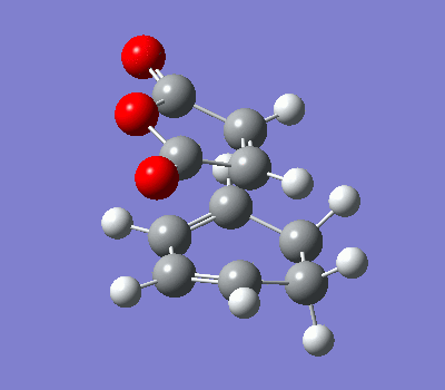 As expected, the exo- adduct is more energetically stable than the endo- adduct by 0.113 kcal/ mol. This is consistent with reported literature that the exo- adduct is the thermodynamic product and the endo- adduct is the kinetic product. The activation energies of the endo- and exo- transition states are calculated to be 28.14 kcal/ mol and 28.90 kcal/mol respectively, using values obtained at the semi-empirical AM1 level of theory. The calculated values differ quite significantly from the experimental value of 11.4 kcal/ mol, and could possibly be attributed to the low level of theory used for the calculations. However, the calculated values do illustrate that the activation energy is higher for the exo- transition state, supporting the analysis that the exo- product is the thermodynamic product.