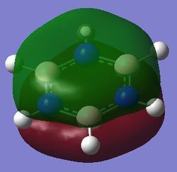 Aromaticity is the delocalisation of electron density around a conjugated, planar ring of atoms. According to Hückel's rule, a cyclic molecule with 4n+2 π electrons (where n is an integer) is said to be aromatic. Benzene contains six pi electrons and follows the Hückel's rule for aromaticity where n=1, hence is considered to be aromatic. Its isoelectronic analogues, boratabenzne, pyridinium and borazine are also aromatic. Although the chemical structure of benzene is drawn to be a six carbon ring with three C=C bonds and three C-C bonds, it can be seen from the MOs that the electron density from the π bonds are spread out evenly around the whole bond. This can be seen most clearly in the pi totally bonding MO, while the π electron density is spread out evenly around the ring of six carbon atoms. While MOs contain formally only 2 electrons each, the distinction between the MOs are not clear in the real computed MOs, and the electron density is visualised as over the whole space of atoms in the MO diagram as shown above. Also, the presence of 6 πelectrons in benzene means that π bonding MOs, including the HUMO and the fully bonding π MO, are fully occupied and contribute to the overall stability of the molecule. If there were only 4 π electrons in the structure, the doubly degenerate HOMO would be each singly filled, leading to an unstable antiaromatic molecule as predicted by the Hückel's rule.