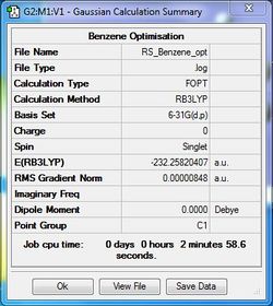 Frequency analysis was carried out to ensure that the optimised benzene molecule was at the minimum energy state. The low frequencies were within acceptable range and no negative frequencies were obtained for the second line. This ensured that the optimisation of the benzene molecule successfully found a minimum energy point.