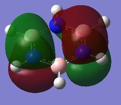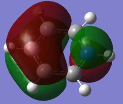 MOs were visualised using the .fch file from the population analysis. It was observed that while the MOs were similar to those of benzene in terms of general ordering and nodes in MOs, the ordering of some MO levels were different and most importantly, MOs that were degenerate in benzene were no longer degenerate in boratabenzene due to the lack of symmetry, caused by the substitution of a boron atom for a carbon atom.