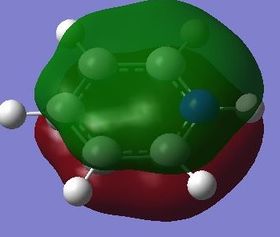 The fully bonding pi MOs of the four molecules are shown as above. The electron density is spread over the top and bottom of the ring, with a nodal plane through the plane of the ring. For benzene each of the carbon atoms in the ring contribute one p orbital to this MO, and since the energy of the atoms are the same, the electron density is spread even over the plane. When the carbon atom is substituted by a more electropositive boron atom in boratabenzene, it is observed that the whole electron cloud is shifted slightly away from the boron atom. In pyridinium, the opposite is true; due to the electronegativity of nitrogen, more of the electron cloud is shifted towards the nitrogen atom. Hence for pyridinium and boratabenzene, the pi electron cloud is not symmetric about the axis perpendicular to the ring. The MO of borazine shows the same even spread of electron density as benzene due to the symmetry of the molecule. The energy of the MOs of benzene and borazine are about the same, while that of boratabenzene is higher and that of pyridinium is lower due to electronegativity differences.