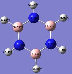 Borazine is a symmetrical about the C3 axis and hence charges cancel out around the ring of atoms and borazine has no dipole moment. The nitrogen atoms and boron atoms have charges of -0.102 and +0.747 respectively. These charges are observed to be of a higher value as compared to the nitrogen and boron atoms in boratabenzene and pyridinium and this is due to the increased difference in electronegativity between nitrogen and boron. This causes the B-N to be more polarised and the atoms to carry higher charges. Overall the charges cancel out and borazine is a neutral molecule.