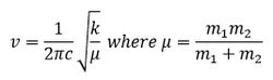 The frequency of a vibration is proportional to the square root of the ratio of the force constant to the reduced mass as shown in the equation below.