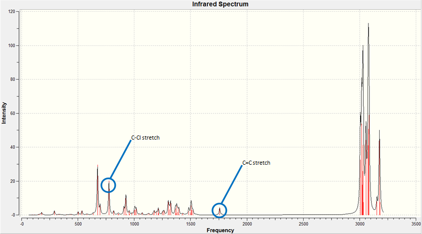 The IR spectrum of the Dialkene molecule was generated using the method described above. Once the vibrations were generated, we used the results to analyse the vibrations of the key functional groups in the molecules, the C-Cl stretch and the two C=C stretches. From the wavenumbers of the vibrations, we can calculate the relative energies of each bond in kJmol-1, a convenient unit to compare across different molecules. The IR spectrum generated and the key vibrations are shown below.