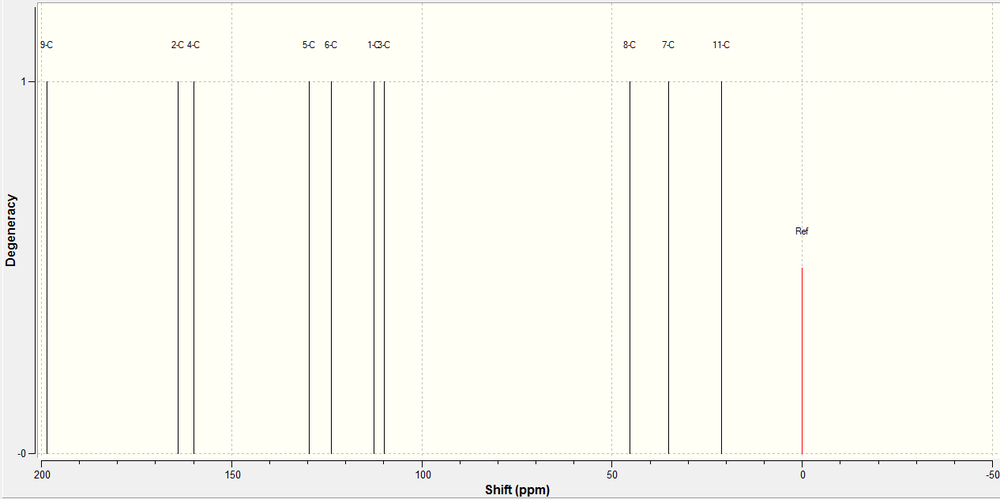 We very rarely observe degenerate carbon atoms in a 13C NMR as they are almost always in different environments to each other. This means that we observe a single peak per carbon in the spectrum, making it easier to analyse the spectra. As you can see from the data above, we get a good correlation between the calculated data and the experimental reported data. We have to understand that there is an intrinsic error in these type of NMR calculations, and this is magnified by the larger chemical shifts, however, we can still say confidently that the correlation between calculated and experimental results is good.
