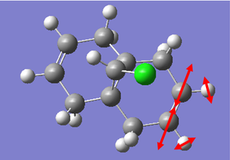 To fully appreciate the lack of secondary orbital overlap in the case of the monoalkene, we can also compare at the C-Cl stretches. In the case of the monoalkene, the bond is 0.04kJmol-1 stronger than the dialkene. This can be explained by the secondary orbital overlap. In the case of the dialkene, the secondary orbital overlap will allow the chlorine to remove electron density from the π cloud of the alkene group. This would increase the electron density on chlorine and thus polarise the C-Cl bond further. This would result in a destabilisation of the bond thus resulting in the vibration occuring at a lower energy in the case of the dialkene than the monoalkene.