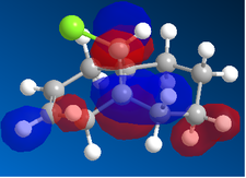 Now, if we consider the case of the monoalkene, we still do see a secondary orbital interaction. However, in this case, the orbitals on the chlorine and the lobe of the π cloud of the alkene are of opposite phases, therefore, this interaction offers no stabilisation of the alkene, in fact, we may observe an destabilisation. Never-the-less, unlike the case of the dialkene, we would not observe any removal of electron density from the the double bond, and therefore, no reduction in suseptability towards attack by an electrophile.