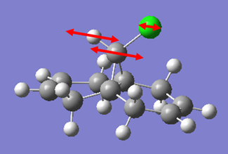 As we can see from the energies calculated from the spectra, the endo C=C bond is higher in energy than the exo C=C (by c.a. 1.17%). This indicates that the endo C=C bond is stronger than the exo one, as more energy is required to cause the vibration. This supports the idea that the endo C=C is stabilised by secondary orbital overlap with the chlorine towards attack by an electrophile, whereas the exo C=C does not have any similar stabilisation.