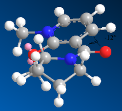 By generating 3D models of the starting material in ChemBio3D, we can see not only is there various stereochemistries around the chiral centre, but we also need to consider the stereochemistry of the carbonyl group with respect to the pyridinium ring. We observe two separate cases for the stereochemistry of that group, it can either be found above the plane of the ring, or below it. These two forms have distinctly different energies, found by using MM2 energy minimizations, and can thus be considered as conformers. The results of these calculations are extremely important to aid the understanding of the orientation of addition of the methyl group and the resulting stereochemistry of the molecule.