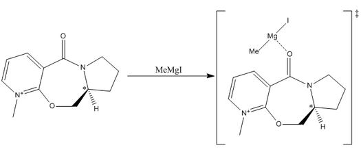 The energy difference of the molecule between the two orientations of the carbonyl group with respect to the pyridinium ring is 6.1kJmol-1, enough to classify the two as conformers. As the conformer with the carbonyl above the plane of the molecule is of lower energy, we can say that it is the most stable conformation of the molecule, and the form that is most present in a sample. This has a major effect on the outcome of the reaction. The attack of a magnesium based grignard reagent on this type of species initially involves an interaction between the magnesium and the carbonyl oxygen[5]. This interaction forces the carbon based nucleophile to attack from the same face as the carbonyl is found with respect to the ring. As we have shown via the MM2 Force Field calculations that the starting product is more stable when the carbonyl is above the plane of the pyridinium ring, therefore, due to the interaction between the carbonyl oxygen and the magnesium in the grignard reagent, the favoured product of the reaction is that with the methyl group also above the plane of the carbonyl. We can demonstrate that the stereochemical control of the reaction is due to this magnesium-oxygen interaction by running MM2 calculations of two forms of the product, one with the methyl group above the plane, one below. The energies of the two forms of the product are almost identical, therefore the preference of products cannot be due to thermodynamics.