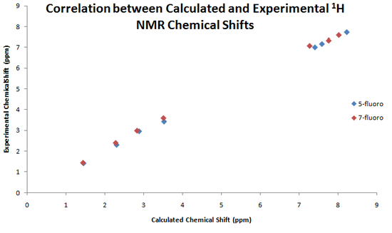 As we can see from the data above, NMR would be a good choice to differentiate between the products. Using 13C NMR would be a better choice than 1H NMR as there are more obvious differences between the spectra for the 5-fluoro and 7-fluoro products. The 13C NMR calculation gives values with an error of approximately 3-5ppm, but still, even considering this, the calculations still agree with the data given in the original paper.