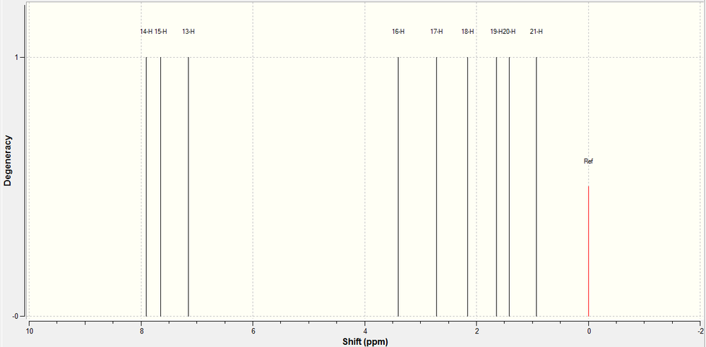 The calculation does not take into account rotations in the molecule, so in the real spectrum we observe time averaging between H21, H20 and H19 into 1 peak, and H13 and H14 although not 1 peak, would be so close in chemical shift, they would most probably be merged into one set of peaks. This is what is observed in the spectrum recorded in literature. We can then average these chemical shifts and compare these to what is recorded in literature and observe the correlation between the recorded spectrum and the calculated one. As we can see from the table above, there is a very good correlation between the calculated data and the experimental data.