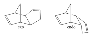 The Exo and Endo isomers are shown to the left. The bridge highlighted in red is the longest bridge, and the bridge the stereochemistry of the molecule is determined with. Once this has been applied to a bicyclic system such as the dimer of cyclopentadiene, we can asign the two isomers as seen to the left.