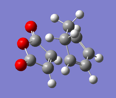 As we are considering a more complex Diels Alder Reaction, the possibilty of Exo- and Endo- products arises. Accordingly, we must consider the transition states of both products. The optimised forms of 1,3-Cyclohexadiene and Maleic Anhydride were copied into the same molgroup and aligned relative to each other in the fashion we would expect of the approach in the reaction. The inter-fragment distance was set to approximately 2.0 Å and the calculation was set up. An opt+freq calculation was run, with optimisation set to TS (Berry) with the force constants calculated once. The AM1 level of theory was used again, and the keywords "opt=NoEigen" were added to prevent the calculation from crashing upon the finding of negative frequencies. The transition state for the exo product is shown below, with its energy, the vibration of the reaction, and the wavenumber of that vibration.