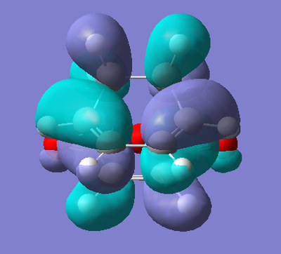 Again, in the case of the endo- transition state, we observe the HOMO and LUMO being combinations of the same orbitals, but with different phases. Both molecular orbitals show the overlap between the HOMO of the 1,3-Cyclohexadiene and the LUMO of Maleic Anhydride. In the case of the HOMO, we observe a stabilising effect caused by the constructive addition of these orbitals, and in the LUMO, we observe a destabilising effect due to the destructive addition of these orbitals resulting in a nodal plane between the fragments.