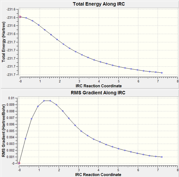 As we can see, this is clearly not the correct structure for the transition state. The QST2 calculation will generate the transition state purely by the linear movement of atoms and groups, it will not take into account the rotation of groups about a bond. For the sake of completeness, I ran the IRC calculation for the wrong boat transition state just to see what the results were like.