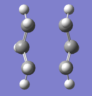 As we can see from the pictures above, the vibration at -818cm-1 is causing the reaction to occur. We observe two of the terminal carbon atoms moving closer together (representing the formation of the bond) and the other two moving apart (representing the braking of a bond). We also observe the movement of the central carbon atoms towards the terminal carbons that move apart. This represents the movement of the carbon carbon double bonds across the molecule.