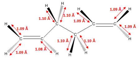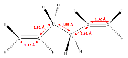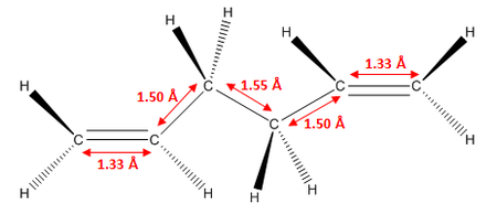 The bond length of the σC-C bonds being formed in the reaction is given as 2.12 Å. In the transition state, the bonds that were the C=C bonds in the cis-Butadiene reagent have a bond length of 1.38 Å, and the bond length of the bond that will become the C=C in the product has a length of 1.40 Å. This tells us that in the transition states, all of the C-C bonds in the cis-Butadiene fragment have roughly the same bond order as each other. As the bond lengths of the σC-C bonds being formed in the reaction are much longer than typical C-C bonds, we can say that the motion of the molecules from reactants to transition state is mostly down to the changing of the electronic structure of the cis-Butadiene than the formation of the new σC-C bonds.