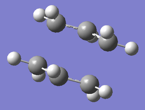 We can use the HF/3-21G level of theory in calculations for a crude approximation of energies. However, if we want a better indication of energy of the molecules, we must go to a higher level of theory. As both the reactants and products only contain carboon and hydrogen, we do not have to use a very complicated basis set or calculation type. Therefore, once the Anti conformation with Ci symmetry was optimised to a HF/3-21G level of theory, we set up a DFT calculation with a B3LYP/6-31G (d) level of theory. This will ensure we get a better representation of the energy of the molecule for further comparison. The results are given below.
