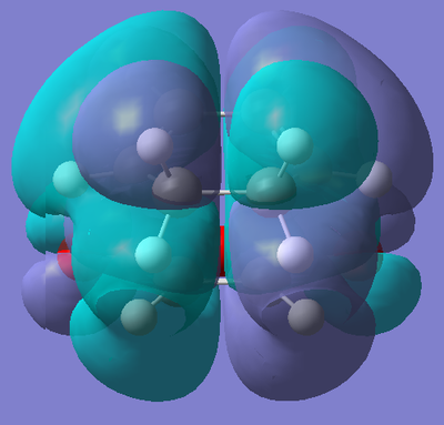 One would initially think that the endo product (and transition state) would be less stable than the exo due to the increased steric bulk around the molecule. However, this is more than compensated for by the presence of a secondary orbital overlap that is present in the transition state for the endo product, but not in the exo one. In order to see this secondary overlap, we need to decrease the isovalue of the Molecular Orbitals to 0.05.