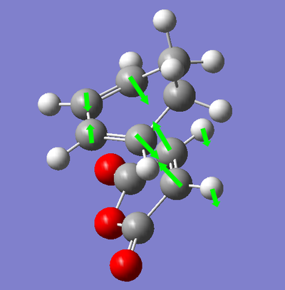 In the vibration from the transition state to the product, we observe numerous effects. We see the synchronous approach of the diene and dienophile together implying a concerted reaction to the product molecule. We see a lengthening of the C=C bonds in the diene, implying that the π bond is being broken. We also see a shortening of the central C-C bond between the two alkene functionalities implying that we are seeing the formation of the π bond. The ends of the diene and dienophile are 2.16 Å apart, much longer than a σ bond, therefore, we can propose that the motion from the reaction to the transition state is the electronic reorganisation of the molecules as opposed to the formation of the bond between the two species.