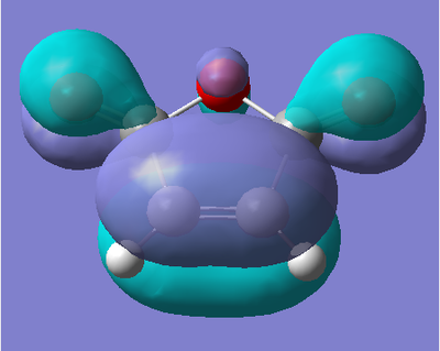 The HOMO of maleic anhydride shows the π bond of the alkene functionality in the molecule. We also see the π bond of the carbonyl groups, with an anti-bonding interaction between the alkene π and carbonyl π orbitals. We also see some contribution to the molecular orbital from one of the lone pairs on the oxygen in the ring of the molecule. The LUMO of the molecule shows the interaction between the π* orbitals on the carbonyl and alkene functionalities resulting in a bonding interaction between them. There is no contribution from the oxygen in this case.