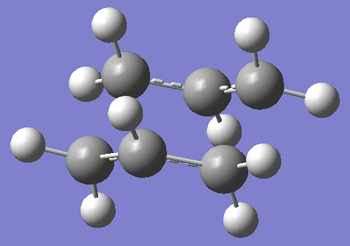 It has been shown that the Cope Rearrangement does not occur from any of these conformations of 1,5-hexadiene. The reaction actually occurs via another Anti conformation, one slightly higher in energy, but that has the correct alignment of fragments to allow the reaction to occur. The molecule was drawn in GaussView and again optimised to a HF/3-21G level of theory. The energy of the molecule was recorded, as was its symmetry point group.