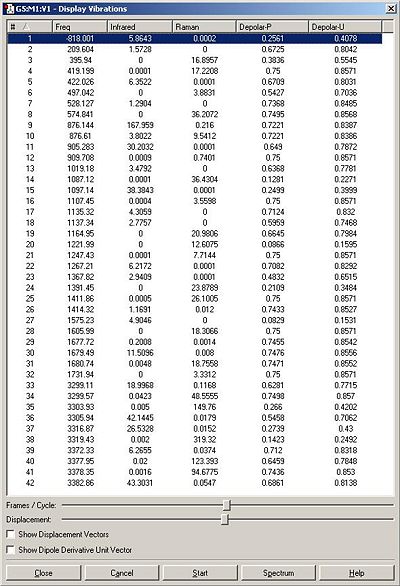 The conformer optimised at the B3LYP/6-31G* level was then used to produce a calculation of the vibrations in the molecule. This is to enable comparison with measurable attributes that can be calculated experimentally.