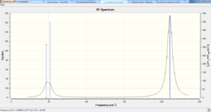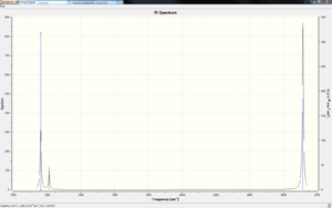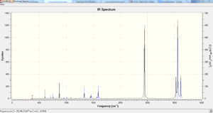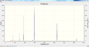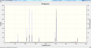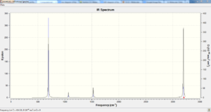 Even though the calculation shows 6 different vibrational modes whereas opening the calculated IR spectrum only 3 peaks are evident is because only 5 out of the 6 stretches are IR active, within these 5 stretches there are two sets of degenerate stretches as shown in the table above summarising the stretches. This means only 3 distinct peaks can be seen in the spectrum. Vibration mode 4 has 0 intensity and therefore is the inactive stretch. Vibration mode 2 and 3 are one degenerate set and vibration mode 5 and 6 are the other degenerate set of vibrations. The intensity of vibrational mode 5 and 6 are much more intense than the other ones as 5 and 6 are stretching the actual bond causing a greater change in dipole moment of the bond whereas the other stretch are distorting the bonds out of plane making the change is dipole moment less varied.