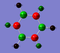 The same method for NBO analysis on benzene was employed on the borazine molecule. The calculations can be found here DOI:10042/22060 . The charge distribution of the molecule is summarised below: