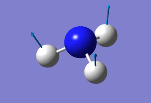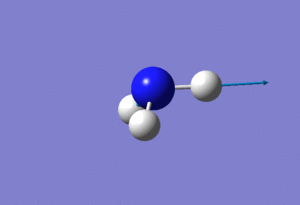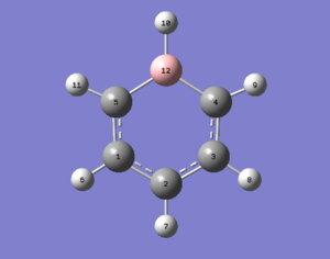 The IR spectrum for pyridinium has a lot more peaks than benzene and once again this is due to more IR active stretches and fewer degenerate vibration modes possibly due to vibrational coupling with the break down of the Born-Oppenheimer approximation thus reducing symmetry within the molecule and this is indicative by the weak intensity of a lot of the peaks observed in the spectrum. The actual symmetry point group label for pyridinium (C2V) is 'lower' than for benzene (D3H) anyways. Once again like boratabenzene and benzene, 30 modes of vibration are calculated which is in agreement with theory from the 3N-6 rule where N=12 and once again the actual frequency where these vibrations occur is similar to the ones found for benzene as only one carbon in the framework is substituted by a nitrogen atom and therefore the strength of C-C bond in pyridinium is very similar to that for benzene. This is in agreement to the determined bond length of the C-C bond in pyridinium being similar to the C-C bond length in benzene. The C-N bond is much shorter relative to the other C-C bond in pyridinium and this can be accounted towards a stronger bond as nitrogen is electron deficient having the positive charge so draws in the electron density from the adjacent carbon making the bond more double-like in nature and therefore stronger. The difference in bond lengths within the framework can explain the disfigured bond angles inside the hexagonal framework from 120° seen in benzene.