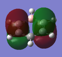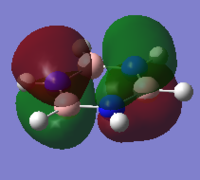 MO 18 In benzene MO 18 is degenerate with MO 19 and shows sigma bonding character not π bonding like MO 17. Between boratabenzene, borazine and benzene, the MOs in shape look very similar with pyridinium being significantly different to the other 3 molecules. Once again the electronegativty of the atom dictates the size of the orbitals with benzene the bonding and anto-bonding component looking very similar on a qualitative approach of looking at the volume the anti-bonding and bonding lobes of the molecule. For boratabenzene carbon's sp2 hybrisided orbitals are lower in energy than the sp2 hybridised boron orbitals resulting in a greater energy mismatch and more diffused orbitals formed which is evident from comparing the lobe at the boron in boratabenzene to the lobe found in the same position on benzene. With borazine the greater diffusion of the orbitals is even greater than for boratazine as all the carbon positions are substituted with two very different electronegative elements causing a greater energy match of the orbitals. With pyridnium the LCAO is different with the most similar MO of benzene being MO 14 (c.f.benzene MO diagram). This shows a change in the ordering of the MOs for pyridinium relative to benzene molecular orbital diagram and therefore we cannot compare directly MO 18 of pyridinium with Mo 18 of benzene.