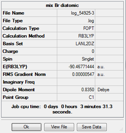 A feature noticed during the initial optimisation step, was the apparant lack of a bond between the Ti and Br atoms in gaussview. This is due to gaussviews way of determining where a bond exists. In reality a chemical bond between two atoms is a result of the sharing of electron density between the two nuclei and the attraction between oppositely charged atoms. The forces involved are effected by the distance between the nuclei and have an optimum distance. If the distance between atoms is significantly higher than pre-determined values gaussview has stored, it does not display a bond. However, this is a cosmetic effect and does not effect the calculations involved.