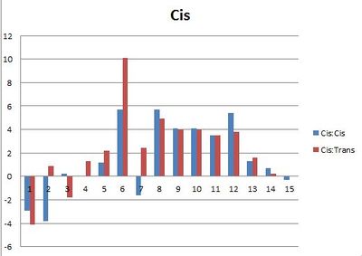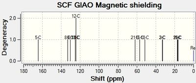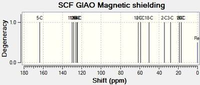 Ideally one of set of bars would be considerably smaller than the other, as then it could definitvely be said that this could be used to distinguish between the isomers. However this isn't the case, most of the bars are very similar in height or the smaller difference is between the wrong sets of data eg cis and trasn as oppose to cis and cis. The most dramatic deviation is at carbon 6. This is the ipso carbon of the aromatic ring, for both the experimental and literature values the cis compound has a higher chemical shift. In the trans configuration, the aromatic ring is aligned with the oxgen of the ester and there will be some orbital interaction, which lowers the chemical shift. This isn't present in the cis configuration so there is a large difference between the values. Because the experimental spectra don't definitively match one isomer or the other, they couldn't be used to determine which isomer an unknown compound is. This may be due to the program, struggling with the molecule. Three membered rings are very strained and therefore can have unusual molecular orbitals. The phosphorus atom also complicates matters. The Phosphorus NMR can also be calculated. Both spectra have a single peak but the shift values are 358.0ppm for the trans isomer and 352.3ppm for the cis isomer, the literature values are 25.5 and 24.2 ppm respectively, so something is clearly wrong. The original literature uses 3JCP coupling constants in order to distinguish between the two isomers, as the cis isomer has a larger coupling constant.[11] However with the Phosphourus NMR being unreliable, it is not worth the computational demand continuing to use this program. It may be that other programs give better results for this system, which could be tried in futher experimentation.