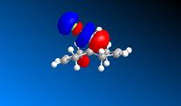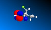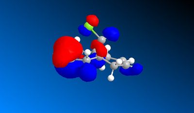 The compound in figure 4 reacts regiospecifically with electrophiles at only one of the double bonds. The reason for this can't be explained using a mechanical method and instead requires an approach that considers the orbitals. The structure was optimized using MM2 and then the MOPAC PM6 MO method was run to give an approximation of the molecular orbitals. From this the HOMO, LUMO and surrounding orbitals can be analysed.