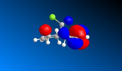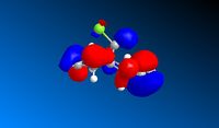 Using Gaussian the vibrational motion of the molecule can be analysed[4][5]. This can be then be compared to the monohydrogenated version where the exo double bond has been replaced by a single bond. In the monohydrogenated version all the vibrations are at lower wavelengths, than in the dialkene. A normal vibration for a double c-c bond is usually at about 1680-1620 cm-1. This is lower than either of the stretches calculated. Therefore the C-Cl bond must be increasing the strength of the double bond, causing it to vibrate at higher frequencies.