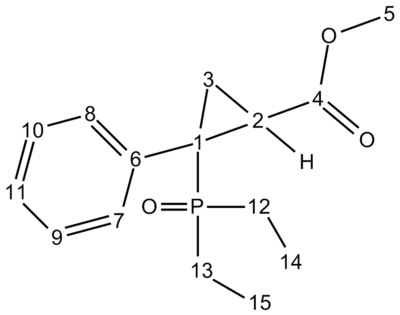 α arylated, β substituted cyclopropylphosphonates can be made electrosynthetically from diethyl alpha, alpha-dichlorobenzylphosphonate and methyl acrylate. The reaction is an electroreduction performed in DMF. The diastereoselectivity depends on the michael acceptor used, and methyl acrylate gives a mixture of the Trans and the Cis isomers, but the Cis isomer is the major isomer. The two different isomers were determined by measuring 3JCP coupling constants. The coupling constant for cis configurations are higher than those for trans configurations.[7] The two structures were optimised using gaussian[8] and then 13C NMR spectrum was predicted and compared with the values in the literature[9][10]. The values for carbon 4 were corrected using 0.96x(value)+ 12.2, as gaussian tends to be out for the carbon of a carbonyl.