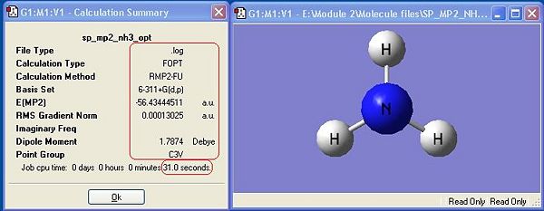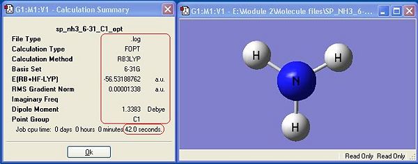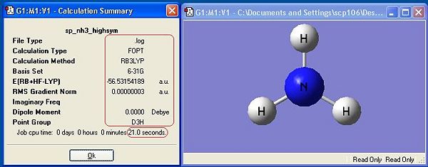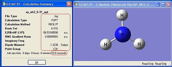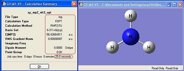 Ammonia, NH3,was chosen as the small molecule to optimise. The optimised molecule and the calculation summary, which contains all the requested information, are displayed below.
