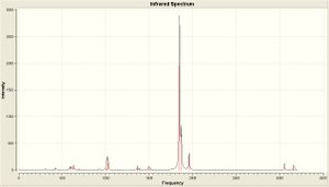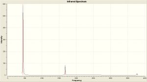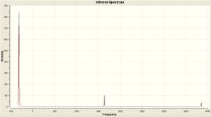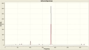 As is clear from the IR there is only one dominant peak in each spectra (at about 1900 cm-1) which corresponds to the C=O stretch. It is also clear that there are numerous peaks for this range in the cis isomer spectra, where the trans spectra has a well defined peak. This peaks have been defined above in the table, as well as the corresponding literature value (or as close as I have been able to tell). The vibrational frequency for the trans isomer compares favourably, and is within 3%. The cis isomer compares equally favourably, with all the calculated frequencies within 3%.