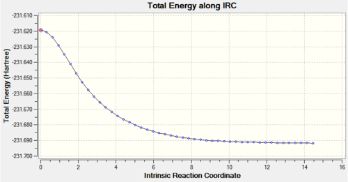 From the graphs of total energy vs IRC and the relative energies listed in the table above, we see that the reactants for the exo-reaction are initially lower in energy, but the exo-transition state and product are higher in energy. The endo-product shows a lower activation energy by 1.35 kcal mol-1.