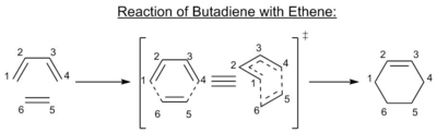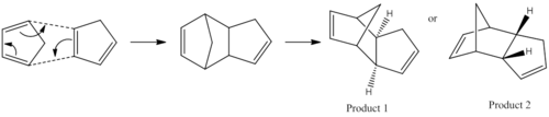 Cyclopentadiene can dimerise through Diel Alder reaction, in which one cyclopentadiene would behave as a diene and the other acts as dienophile. As a result, one of the π systems contributes 4 electrons and the other 2 π electrons, resulting in a thermal reaction proceeding via a Huckel topology. Therefore the system can be classified as a π4s + π2s cycloaddition reaction. If both bonds form on the bottom face of the diene and the top face of the alkene, this is the exo form. Whereas the endo isomer is when the bonds are formed to the bottom face of the alkene.