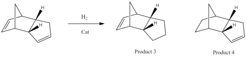 Practical experiments show that product 4 is the main product that is formed; With the hydrogenation of the norbornene being five time faster than the hydrogenation of the cyclopentene ring.[1]