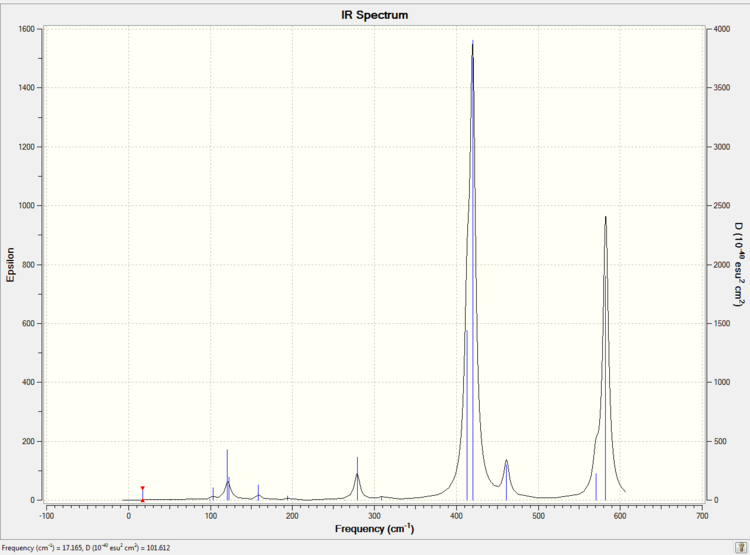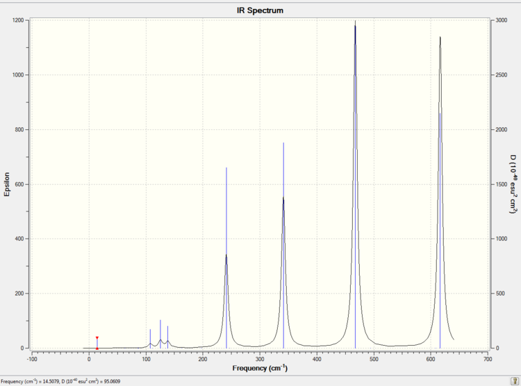 In the IR spectrum, there are only three peaks. The three peaks are 1163 cm-1, 1213 cm-1, 2716 cm-1 separately. However, six vibration modes were calculated. The vibration modes 2 and 3 are degenerate and at the frequency 1213 cm-1. The vibration modes 5 and 6 are degenerate and at the frequency 2716 cm-1. The stretch of mode 4 is totally symmetric so this mode cannot be detected by IR.