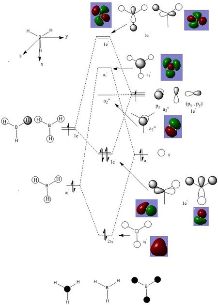 A BH3 molecule was created by GaussView 5.0. The bond length of the three B-H bonds were set to 1.53 angstrom, 1.54 angstrom, 1.55 angstrom separately. The BH3 molecule was optimized using the method: B3LYP and the basis set: 3-21G.