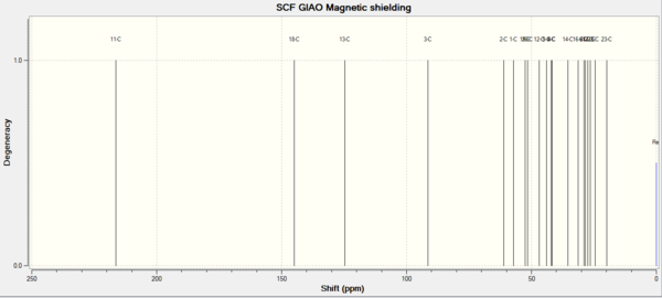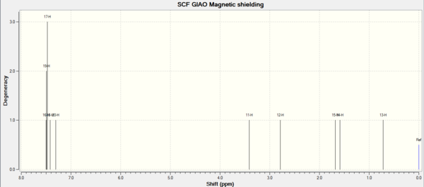 The simulated H and C NMRS have similar values with literature. The biggest difference occurs in carbon3. In literature, the chemical shift of carbon 3 is 72.88ppm. However in the simulated NMR, the chemical shift of carbon 3 is 91.40. Because carbon 3 connects to two sulfur atoms. It is the spin-orbital error( carbon attaches to heavy elements)