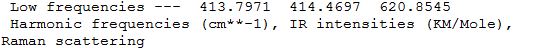 in the IR spectrum 3 peaks are visible, though there are predicted 6 peaks. the reason for this is only 5 of the modes are IR active with the with the other 2 modes being degenerate. the mode NUMBER is also inactive since is doesnt have a dipole moment, with the final modes NUMBERS having the same symmetry (E') and hence seen as one peak due to them being degenerate.